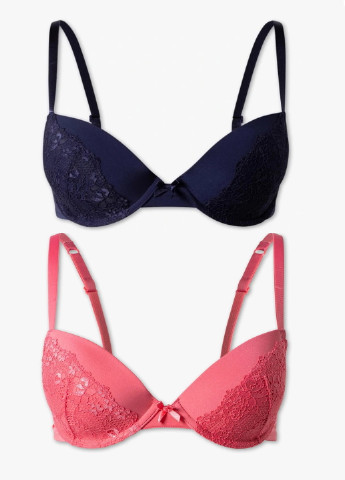 Комплект бюстгальтерів із 2-х од. Формовані чашки з кісточками, що формують. Регульовані лямки, бантик між чашками, регульована застібка-гачок на спині. Підтримує груди знизу. Перевірено на вміст шкідливих речовин згідно з STANDARD 100 компанією OEKO-TEX®.