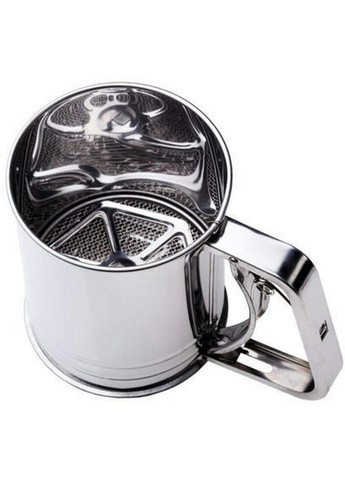 Сито механічне з нержавіючої сталі для просіювання борошна, цукрової пудри, манки, какао та дрібних сипучих продуктів. Приготування їжі займає важливе місце у житті. Нам не обійтись без неї. Від отриманої їжі багато в чому залежить наше здоров'я та самопочуття. Багато залежить також і від якості кухонних інструментів та начиння. Важливим предметом на будь-якій кухні є сито для просіювання, завдяки якому будь-які крупи, борошно просіваються швидко і легко. Кожна господиня знає, щоб зробити пишне тісто треба: перед додаванням борошно обов'язково просіяти через сито, воно насичується киснем, очищається від сторонніх домішок та випадкових предметів. Кухоль-сито чудова ємність для просіювання борошна. Кухоль складається зі сталевого корпусу з подвійним ситовим дном і ручки, всередині якої знаходиться пружина з нержавіючої сталі. Нержавіюча сталь характеризується гігієнічною поверхнею, не впливає на смакові та колірні якості їжі, легко та швидко чиститься. Завдяки ручці-важелю ви з легкістю просієте борошно без зайвої тряски та розпорошення борошна. Просто насипаєте борошно в чашку, натискаєте на важіль, борошно сипеться в ємність. Принцип дії: Натискаєте на ручку, обертаються ножі-розсікачі між ситами, борошно (какао і т.д.) просівається прямо в потрібне місце. Не треба трусити, як звичайне сито! Наше чудове сито для борошна поєднує в собі чудовий дизайн і виняткову функціональність! Завдяки йому борошно, а також велика кількість цукрової пудри або какао, просіюються дивовижно швидко і легко, і без комочків. Характеристики: Матеріал: нержавіюча сталь; Подвійне сито; 3 ножа-розпушувача;