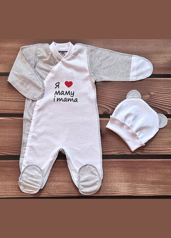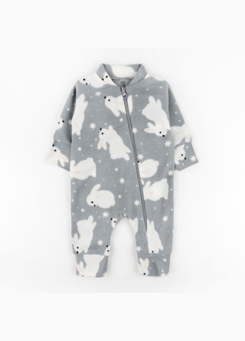 Комбінезон для хлопчика. Комбінезон прикриває тіло малюка від шиї до п'ят, має застібки у вигляді кнопок спереду. Довгі рукави на манжеті, штанини з шкарпеткою внизу. Виріб розстібається по всій довжині. Спереду зображені жирафи та зебра.