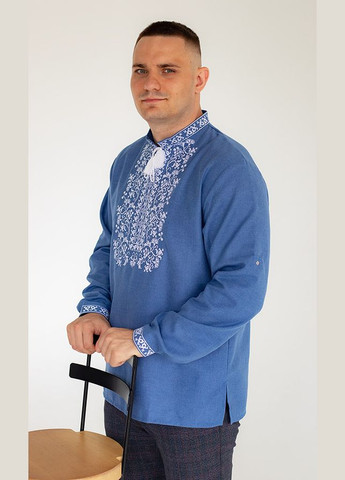 Узор розміщений на грудях та манжетах. Модель вільного прямого крою, комірець стійкою, горловина з зав'язками. Колір тканини - під натуральний льон. Тканина: напівльон.