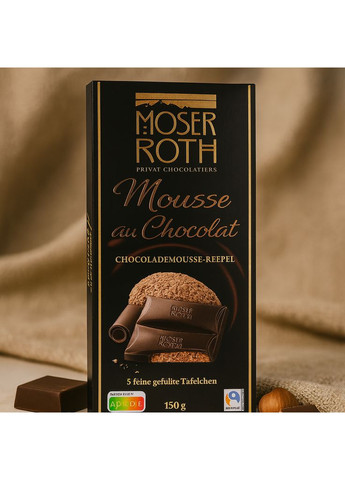 Moser Roth Чорний шоколад з шоколадним мусом, 150 г — це справжнє задоволення для поціновувачів витонченого смаку. Насичений темний шоколад із високим вмістом какао ніжно поєднується з повітряною шоколадною начинкою-мусом, створюючи гармонію глибокого смаку й легкої текстури. Ідеально підходить для солодкої паузи протягом дня або як елегантне доповнення до чашки кави чи келиха вина. Вироблений за німецькими стандартами якості, цей десерт дарує справжню насолоду кожному шматочку.