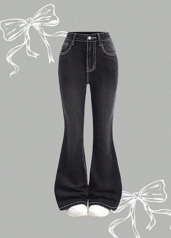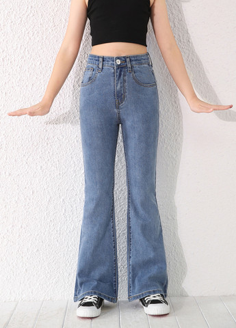 Джинси SHEIN Girlism Tween. Ці джинси крою, що облягає, з високою талією і розкльошеними брючинами виконані з деніму середньої еластичності. Застібка на блискавку а також гудзик, є кишені. Рекомендується прати у пральній машині; хімчистка заборонена.