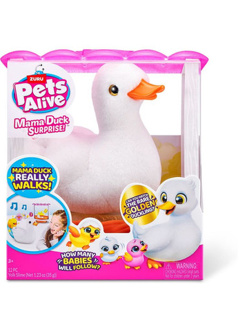 Знайомся з качиною родиною у наборі Pets & Robo Alive Мама качечка з сюрпризом. Тут ти знайдеш білосніжну качечку із золотавими очима, яка живе у своєму власному барвистому будиночку із затишним гніздом. Вона знесла чотири яйця з сюрпризами всередині. Цікаво, що ж там? Нумо дізнаватися, що на тебе чекає. Щоб розпочати захопливу гру, качечку спочатку потрібно розбудити. Для цього переведіть кнопку з положення off в on на її животику.Знайди й натисни на крилі пташки рожеве сердечко-кнопку. Після цього вона починає реалістично рухатися зі сторони в сторону й видавати веселі крякання. У мами качечки неймовірно м'яке хутро, приємне на дотик. У домівці-гнізді знаходяться чотири яйця з сюрпризами. Щоб дістати їх, необхідно потягнути невеликий важіль і повністю відкрити кришку. Тоді яйце швидко вистрибне, лише встигни зловити! Шукайте рідкісне золотисте яйце.У кожному яйці можуть бути заховані або каченята, або наліпки, або слайм у вигляді яйця. Ви можете знайти від 2-х до 4-х різнобарвних каченят: білого, жовтого, рожевого, або рідкісного золотистого. Комплектація набору та кількість каченят в ньому може відрізнятися. Відкривайте та дізнавайтеся, які сюрпризи дісталися саме вам! Влаштуйте цікаву прогулянку для мами-качки разом з її дітками! Каченят з’єднуйте між собою за допомогою магнітів у дзьобиках і хвостиках. До мами-качки каченята приєднуються дзьобиком до магніту під маминим хвостиком.Качка може видавати різні звуки після приєднання до неї будь-якого каченяти.Після гри, поверніть маму-качку й каченят у їхній будиночок, у якому їх зручно зберігати після гри. Іграшка сприяє емоційному розвитку, розвиває уяву й уміння гратися. Елементи живлення: 3 батарейки типу ААА (не входять до набору).