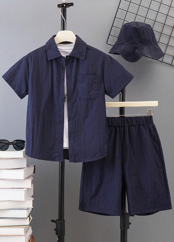 Темно-синій повсякденний комплект одягу для хлопчиків складається з однотонної сорочки та шортів у поєднанні з капелюхом-ковшем.