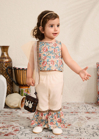 Комплект із трьох предметів SHEIN для дівчаток. В комплект входять топ з оборками, смугасті штани, що розкльошують, і сітчаста накидка. Верхня частина має круглий виріз та класичний крій. Штани довгі та виконані з принтованої тканини. Рекомендації по догляду: машинне прання, не піддавати хімчистці.
