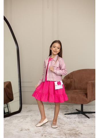 Дитячий весняний комплект для дівчинки: сукня малинового кольору із тканини софт та жакет із екошкіри. Сумочка у комплекті. Сукня дуже легка, повітряна, прекрасне поєднання як на свято так і для повсякденного носіння.