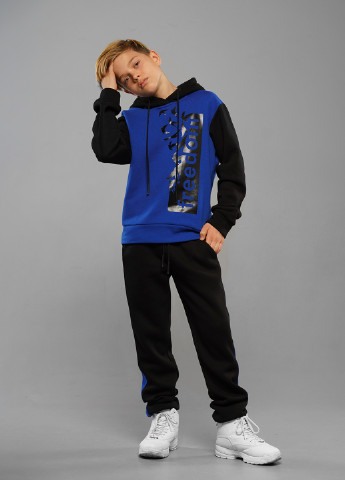 Теплий підлітковий костюм із якісної турецької тринитки з начосом. Костюм вільного крою. Толстовка з глибоким двостороннім капюшоном з регульованою лаштункою. На лівому боці по переду трафаретний друк. Внизу толстовки — манжет. Горловина оброблена еластичною стрічкою. Еластичний пояс з регульованою лаштункою на штанах. Дві бічні кишені. Яскраві вставки з бокових швів. Еластичні манжети на щиколотці.