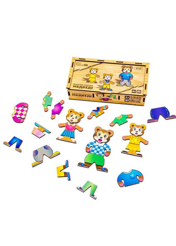 До комплекту входять коробка з 4 відділами та пластинки з натурального дерева з зображеннями різноманітних предметів, які відрізняються кольорами. Малюнки милих звірят, фруктів, побутових предметів вже знайомі діткам і легко впізнаються навіть найменшими. Всі деталі мають закруглені краї, тому цілком безпечні і зручні. Дитина вивчатиме кольори в ігровій формі, розвиватиме дрібну моторику рук, спритність та координацію, вкладаючи пластинки в прорізи коробочки.