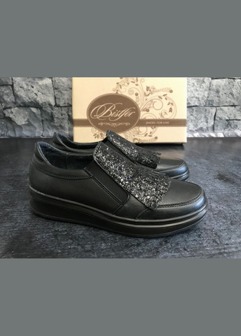 Модель туфель для дівчат зроблена в комбінації натуральної шкіри та замші, чорного кольору. У внутрішній стороні взуття підкладка, устілка і супінатор, виготовлені з натуральної шкіри. Липучка-застібка на підйомі стопи забезпечує максимальний комфорт при одягання і ідеальну посадку на нозі. Підошва зроблена з ТЕП (термоеластопластів) - зносостійка.