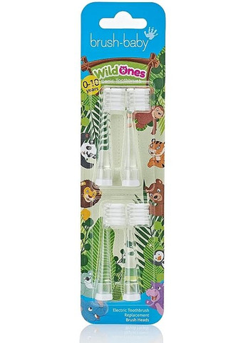 Змінні насадки для щітки Brush-Baby Sonic WildOnes з м'якою щетиною DeepClean: більш короткі щетинки очищають поверхню зуба, довші щетинки призначені для очищення міжзубного простору. Відмінно підходить для дітей, які ще не вміють чистити зуби, мають прогалини або відсутні зуби. Упаковки із 4 насадками вистачить на рік використання. Змінна насадка та упаковка від щітки підлягають переробці.