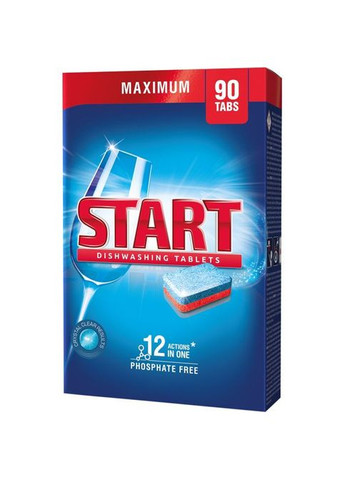 Таблетки для миття посуду в посудомийних машинах START Maximum - мультифункціональний засіб “Все в одному”/«All in One» Ефективно очищує складні забруднення для неймовірної чистоти посуду Залишає фільтр чистим від жирових відкладень Захищає нагрівальний елемент машини від вапняного нальоту Усуває наліт від чаю та кави Включає «2Х» функцію пом'якшення води Включає функцію ополіскувача Ефективний на низькотемпературних режимах еко - циклів