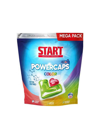 Капсули для прання Start Color. Ефективна комбінація потужних інгредієнтів глибоко очищає від забруднень, плям, неприємних запахів, зберігаючи яскравість кольорової білизни. Для прання білизни до 4,5 кг середнього або легкого ступеня забруднення в мякій воді використовуйте 1 капсулу. Для прання білизни понад 4,5 кг у жорсткій воді або сильно забруднених речей використовуйте 2 капсули.