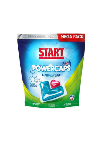 Капсули для прання Start Universal. Потужна формула суперконцентрату виводить сильні забруднення, плями та неприємні запахи, піклується про кольори, забезпечуючи бездоганний результат прання. Для прання білизни до 4,5 кг середнього або легкого ступеня забруднення в м'якій воді використовуйте 1 капсулу. Для прання білизни понад 4,5 кг у жорсткій воді або сильно забруднених речей використовуйте 2 капсули.