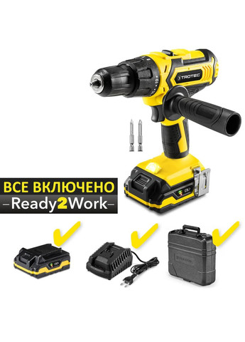 Акумуляторний ударний дриль-шурупокрут Trotec PHDS 11-20V сертифікований в Україні і має сертифікат відповідності чинним стандартам якості та безпеки. На додаток літій-іонний зарядний пристрій з акумулятором також пройшли випробування на безпеку, так що ви можете бути в повній безпеці з якістю Trotec. Компанія Trotec для всіх своїх акумуляторних інструментів використовує Li-Ion батареї типу NMC (із нікеле-марганцево-кобальтовим катодом), що забезпечує стало високу потужність інструменту, не залежно від поточної ємності акумуляторної батареї, та запобігає саморозряду батареї протягом років. Тобто якщо ви не користуєтесь інструментом протягом тривалого часу - будьте впевнені, що коли він вам знадобиться - батарея лишиться зарядженою. Від легкого загвинчування шурупів у м'яку хвойну деревину до потужного ударного свердління твердої цегляної кладки - ударний дриль-шурупокрут Trotec PHDS 10-20V є потужним універсальним рішенням для практично всіх свердлильних або загвинчувальних робіт у будинку, саду чи в гаражі. Ті, хто вважав, що бездротовий акумуляторний інструмент просто не має достатньої потужності для ударного свердління, тепер можуть відчути, на що здатний акумулятор преміум-класу MultiFlex 20 В. Завдяки максимальному крутному моменту 40 Нм і частоті ударів до 26 400 на хвилину Trotec PHDS 11-20V легко свердлить не тільки в деревині, але й у металі, цеглі та бетоні. Дриль-шурупокрут оснащений гальмом швидкої зупинки та блокуванням вимикача, що запобігає випадковому ввімкненню ударної дрилі. У комплект поставки також входить знімна рукоятка, що монтується ліворуч або праворуч, і забезпечує точне спрямування свердління. Крім того, вбудована світлодіодна лампа гарантує, що робоча зона завжди буде добре освітлена в місцях, де недостатньо світла. Міцний 2-швидкісний металевий редуктор та безступінчасте регулювання швидкості дозволяють застосовувати дозоване зусилля в будь-який час коли це потрібно. 20 ступенів крутного моменту плюс ступінь свердління та додаткова ступінь ударного свердління роблять Trotec PHDS 11-20V універсальним майстром для всіх ваших потреб. Швидкозатискний патрон забезпечує швидку заміну біти або свердла однією рукою, а автоматичне блокування шпинделя забезпечує кращий рівень безпеки завдяки більшому зусиллю затиску інструменту. Патрон дозволяє закріпити практично будь-які доступні свердла, біти та насадки діаметром до 13 мм. Довговічний і ергономічний корпус Trotec PHDS 11-20V з оптимізованим центром ваги, гумовими вставками та додатковим бічним руків’ям забезпечує надійну хватку для тривалої і точної роботи без втоми. Завдяки металевій кліпсі, що входить у комплект, інструмент можна закріпити на поясі, так він не буде заважати та лишатиметься під рукою. Потужна акумуляторна батарея FlexPower 20 В слайдерного типу не має ані ефекту пам’яті, ані саморозряду завдяки літій-іонній технології, і її можна повністю зарядити менш ніж за годину за допомогою зарядного пристрою з функцією швидкого заряду, що входить у комплект. А головне, що завдяки концепції Trotec FlexPower батарею можна використовувати для багатьох інших електроінструментів Trotec. Технічні характеристики: Тип: ударний дриль-шурупокрут; Номінальна напруга: 20В Кількість передач: 2 (Холостий хід 1-ша передача: 0 - 400 об/хв; Холостий хід 2-га передача: 0 - 1650 об/хв) Кількість ступенів крутного моменту: 20 + 1 (ст