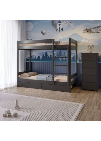 Двох'ярусне дитяче ліжко Mebigrand Атланта Міні з шухлядами Дитяче двоярусне ліжко Атланта Міні з шухлядами від Mebigrand - це стильне та функціональне рішення для затишної дитячої. Універсальна конструкція дає змогу утримувати драбину та захищати огорожу як з лівого, так і з правого боку, що робить ліжко максимально зручним для будь-якого планування кімнати. Це дає можливість меблям з урахуванням індивідуальних особливостей і внутрішнього простору зробити її ще більш практичною. Безпека дитини стоїть на першому місці, тому ліжко обладнане міцним бортиком, що запобігає випадковому падінню під час сну. Надійні сходи мають міцну сходинку, яка забезпечує зручний і безпечний підйом на другий ярус. Такий продуманий дизайн робить ліжко не тільки зручним, а й затишним. Матеріал виготовлення Ліжко виготовлене з міцного масиву сосни, що забезпечує збереження і надійність. Конструкція з ламелей забезпечує оптимальні умови для комфортного сну. Екологічно чисті фарби і лаки, використані в покритті, безпечні для дітей і зберігають природну текстуру деревини, при цьому меблі мають привабливий вигляд. Ортопедичні ламелі Ліжко комплектується ламелями, що забезпечують оптимальну підтримку матраца і правильне положення тіла дитини під час сну. Ламелі сприяють вентиляції матраца, що підвищує комфорт і забезпечує здоровий відпочинок. Особливості: Міцність і безпека. Ліжко виготовлене з високоякісних матеріалів, що забезпечує його надійність і тривалий термін служби. Верхній ярус оснащений безпечним захисним бар'єром, який гарантує вашій дитині комфорт і безпеку під час сну. Стильний дизайн. Елегантний зовнішній вигляд, що підходить для будь-якого інтер'єру дитячої кімнати. Ефективне використання простору. Двоярусна конструкція допомагає оптимізувати простір у кімнаті. Забезпечує дитині комфортний сон і зручне місце для ігор. Висувна шухляда. Ліжко оснащене шухлядою з телескопічними напрямними, що дають змогу зберігати книжки, іграшки або постільну білизну прямо під ліжком, зберігаючи простір у дитячій кімнаті. Крайка 2 мм - захищає краї виробів від пошкоджень, надає їм естетично завершеного вигляду і підвищує довговічність меблів. Крайку виготовляють із міцних матеріалів, що дає змогу їй витримувати інтенсивне використання і зберігати привабливий зовнішній вигляд протягом багатьох років. Характеристики: Габарити (ДхШхВ): 200 х 70 х 171 см Розмір спального місця: 70 х 200 см Комплектація матрацом: Ні Висувна шухляда: Так Тип основи для матраца: дерев'яні ламелі Матеріал: Сосна Колір ліжка: Світло-сірий Комплектація: Переднє знімне коротке захисне огородження верхнього ярусу. Заднє стаціонарне довге захисне огородження верхнього ярусу. Заднє знімне довге захисне огородження нижнього ярусу. Комплект ящиків.
