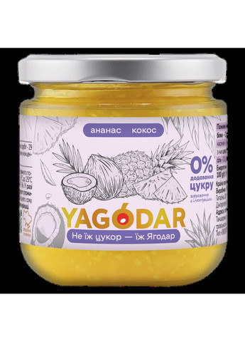 Замовте ананасовий джем без цукру з кокосом ТМ Ягодар 210 г Інгедієнти: Ананас- 48%; сорбітол; вода; кокосова стружка - 2%; пектин; сік лимонний . Поживна цінність на 100 g (г) продукту: Білки - 0,3 g (г); Жири - 0,8 g (г), з них насичені - 0,0 g (г); Вуглеводи - 26,5 g (г), з них цукри - 5 g (г), поліоли (сорбітол) - 20 g (г); сіль - 0,0 g (г); харчові волокна - 1,0 g (г). Енергетична цінність на 100 g (г) продукту: 478,6 kj (кДж) / 114,4 kcal (ккал). Умови зберігання: Температура: від 0 C до 25 C Вологість повітря: не більше 75% Зберігати в захищених від сонячних променів приміщеннях в оригінальній нерозкритій упаковці Після відкриття продукту зберігати в холодильнику та використовувати протягом 7 днів Примітка: Можливо виділення фруктово-ягідного соку Дата виробництва та "Краще спожити до" вказані на кришці Номер партії L відповідає даті виробництва Під час відкриття банки переконайтеся, що є ущільнювач. Якщо його немає, не використовуйте продукт. Усі джеми на пектині – натуральному веганському загуснику, що не містить желатин, з додаванням свіжих домашніх ягід та фруктів. Найкраще вони підходять для млинців, вафель, тортів, рогаликів, печива та інших десертів. А ще їх можна додавати в чай, готувати з них компот, смакувати з м'ясом, рибою, гарнірами, кашами або просто насолоджуватися ложкою. Містить понад 10% доданих поліолів (сорбіт), використання яких дозволено законодавством. Надмірне споживання може спричинити послаблювальний ефект. Не пропустіть нагоди відчути справжнє солодке поєднання натуральних смаків! Купуйте вже зараз.
