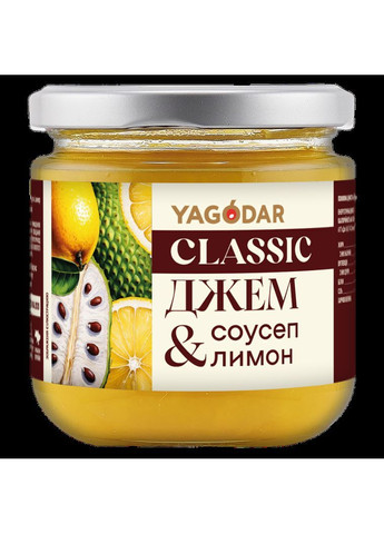 Фруктовий джем YAGODAR Саусеп і Лимон поєднує тропічну ніжність саусепу з яскравою кислинкою лимона. Незвичний смак, що освіжає та додає екзотики до будь-якого десерту. Умови зберігання: Температура: від 0 C до 25 C Вологість повітря: не більше 75% Зберігати в захищених від сонячних променів приміщеннях в оригінальній нерозкритій упаковці Після відкриття продукту зберігати в холодильнику та використовувати протягом 7 днів