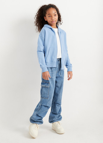 Дитячі джинси, звужені донизу. Тканина щільна, трохи тягнеться. Вгорі на резинці. Позаду дві кишені, талія на гумці.