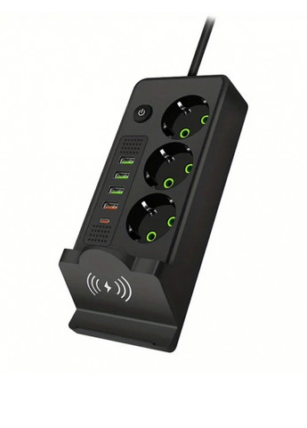 Мережевий фільтр 2500w з бездротовою зарядкою має 3 євро-розетки із заземленням, 4 автоматичних USB порти та 1 порт Type-C. Роз'єми USB можуть видавати максимум 3.4A. Розумний чіп автоматично визначає необхідну силу струму і підлаштовується під підключений пристрій. Кабель подовжувача має довжину 3 метри. На корпусі пристрою зручно розташована кнопка вмикання/вимикання живлення всього подовжувача.