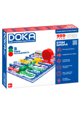 Гра Конструктор електронний DOKA ШКОЛА «999+ СХЕМ» безсумнівно сподобається юним дослідникам! Збираючи конструктор, дитина познайомиться з дивовижним світом електроніки в ігровій формі. Управління в схемах може бути ручне, магнітне, світлове, водяне, звукове, електричне, а також сенсорне. Завдяки оригінальному способу з’єднання деталей Ви зможете домогтися швидкого і ефективного результату без використання паяння. Електросхеми діляться на кілька рівнів складності: Найпростіші схеми - електричні. Ці схеми наочно показують дитині, як по дротах йде електричний струм. На рівень складніші - електронні схеми. Розраховані на молодший і середній шкільний вік. Зібрати можна такі схеми: Дверний дзвінок зі світломузикою. Пропелер, який літає. Світлодіод. Електровентилятор. Електролампа. Дверний дзвінок з музикою. Лампа зі звуковим керуванням. Маленький амперметр. Лампа з таймером. Детектор руху. Генератор електрики. Вольтметр. Радіоприймач. Детектор брехні. Барометр. Мікрофон. Електроцикада. Метроном. Піаніно зі світловим керуванням. Світлова рушниця. Вуличний ліхтар. Маяк, який включається автоматично. Радіостанція. Гудок. Сигналізація. Генератор звуку. Мегафон. Вимірювач вологості. Світлофор. Цифровий диктофон. Нічник з таймером та багато іншого. Зібравши електричну схему, можна одержати акустичний, оптичний або електричний вихідний сигнал. Створюються такі ефекти: Сирена пожежної машини. Звук азбуки Морзе. Голос тварин. Програвання музики. Звук скрипки. Звук бластера. Бурчання літака. Стук телеграфу. Дзвінок дзвіночка. Ревіння мотоцикла. Скрипіння дверей. Гудок теплохода. Сирена ""швидкої допомоги"" і багато іншого. Конструктор складається з наступних елементів: Сполучні дроти. П'єзовипромінювач. Сенсорна пластина. Геркон (магнітокеруючий контакт) з магнітом. Кнопковий вимикач. Вимикач. Фоторезистор. Червоний світлодіод. Лампа 2.5 В. Кріпильні тримачі для батарейок. Динамік. Інтегральна схема музична. Інтегральна схема сигнальна. Інтегральна схема "зоряні війни". Електромотор з пропелером. Антена. Зелений світлодіод. Лампа 6 В. Мікрофон. Інтегральна схема "підсилювач потужності". Резистори 100 Ом, 1 кОм, 5 кОм, 10 кОм, 100 кОм. Конденсатори 0.0 2мкФ, 0.1 мкФ, 10 мкФ, 100 мкФ, 470 мкФ. Інтегральна схема "підсилювач високої частоти". PNP транзистор. NPN транзистор. Реостат. Інтегральна схема "FM діапазон". До набору також входить інструкція, яка містить ілюстрації - від простих до складних схем, - і 999 описів схем, які ви зможете легко зібрати. Розвиток Електронний конструктор розвиває у дитини дрібну моторику, увагу, логіку, память та математичні здібності. Особливості: Бренд: DOKA; Країна бренда: Україна; Країна виробництва: Китай; Рекомендований вік: від 8 років; Матеріал: пластик, метал; Живлення: 4 батарейки АА (не входять до комплекту); Габарити іграшки: 19х28х5 см; Комплектація: деталі конструктора, монтажна плата, посібник.
