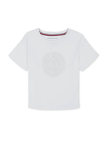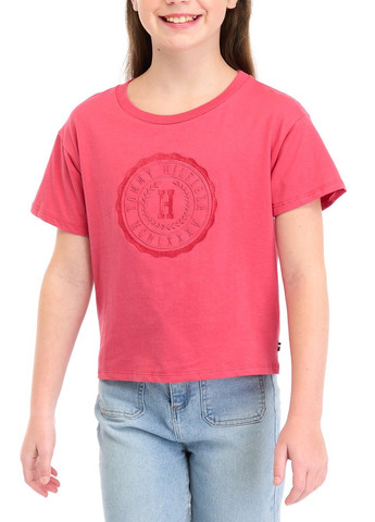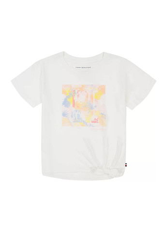 Дитяча футболка Tommy Hilfiger. Яскрава футболка з декоративним вузлом. Круглий виріз. Короткий рукав. На грудях яскравий логотип бренду та малюнок із двосторонніми паєтками. На подолі декоративний вузол. М'яка, приємна тканина. Відмінна якість.