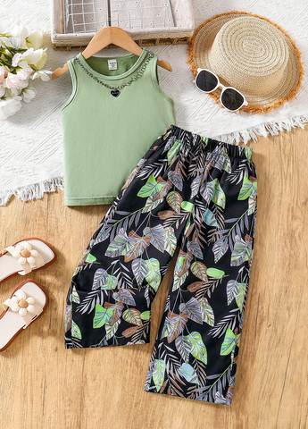 Комплект із двох предметів SHEIN. Цей комплект включає майку без рукавів і штани вільного крою. Штани з принтом у вигляді тропічного листя. Верхня частина має круглий виріз та класичний крій. Обидва вироби виготовлені із тканого матеріалу. Склад штанів: 95% поліестер, 5% еластан. Верхня частина: 62% поліестер, 34% бавовна, 4% еластан.