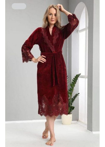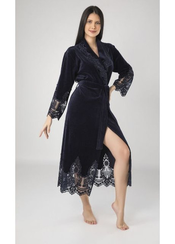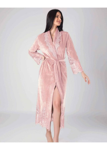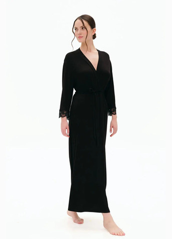 довгий однотонний халат із бамбукового полотна; ніжний бамбук приємний до тіла, не мнеться, добре пропускає повітря та вбирає вологу, не подразнює шкіру, створює ефект прохолоди на тілі, відноситься до різновидів віскози; крій на запах дозволяє регулювати посадку по фігурі; довгі прямі рукави із мереживом; зав'язується на талії поясом.
