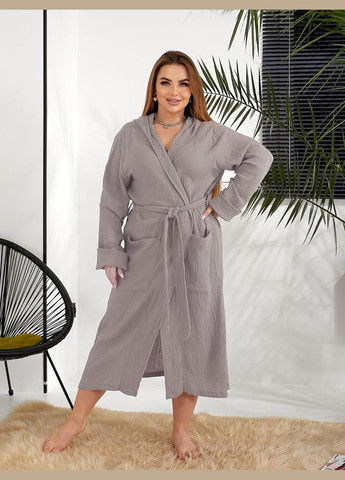 Халат із фактурного мусліну DUNA. Тканина має фактурне ущільнення ниток, що створюють малюнок у вигляді перетину ниток. Тканина йде із двох шарів. Внутрішня сторона дуже м'яка та ніжна, приємна тілу. Зовнішній бік фактурний трохи грубіший, що нагадує лляну фактуру. Тканина лягає гарними легкими складками, не просвічується. Тканина: 100% бавовна Щільність: 140 г/м2 Колір: сірий Розміри: s, m, l, xl На моделі розмір М, параметри моделі: Зріст 168 92/67/93