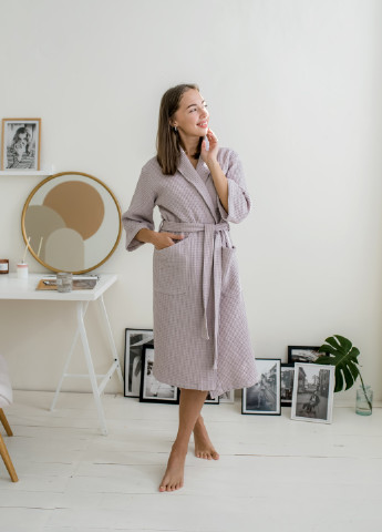 Вафельний халат з шалевим коміром та накладними кишенями. Вафельна тканина завдяки своїй структурі здається об'ємною, але вона легка, набагато тонша махри і висихає швидше, при тому, що вологу вбирає втричі краще звичайного гладкого бавовняного полотна. Колір: лавандово-сірий. Тканина: 100% бавовна, Туреччина. Довжина халата 110 см