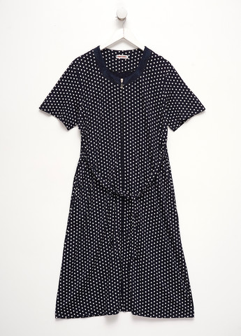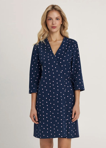 Легкий халат довжини нижче колін вільного крою з короткими рукавами та дрібним принтом в крапку — комфортний варіант для повсякденного гардеробу. Вільний крій забезпечує свободу рухів, а застібка на ґудзиках гарантує зручність під час одягання та знімання халату. М'яка натуральна тканина підходить навіть для чутливої шкіри. Натуральна тканина з бавовни, яка додає їх схожих характеристих: високий рівень гігроскопічності та повітропроникності. Відмінність полягає в тому, що поверхня набивної тканини покрита якісним друкованим візерунком з використанням інноваційних технологій.