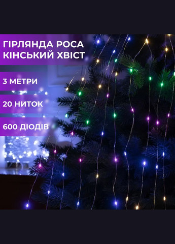 Світлодіодна гірлянда-нитка Роса створена для того, щоб миттєво перетворити будь-який простір на святкову казку. Її особливість маленькі LED-діоди у формі крапель роси, розташовані на тонкому гнучкому мідному дроті. Завдяки тонкому проводу гірлянду легко формувати, створюючи будь-які декоративні композиції: оформлення ялинок, святкових фотозон, інсталяцій або навіть використання як нічника. Гірлянда має 8 режимів роботи, між якими перемикаються за допомогою пульта, що дозволяє обрати оптимальне мерехтіння залежно від атмосфери та настрою. Особливості та переваги гірлянди: Гнучкість та компактність: тонкий провід дозволяє легко створювати бажану форму; Динамічне світло: 8 режимів для різних ефектів; Універсальне застосування: декор інтерєру, ялинок, фотозон, інсталяцій; Надійність: діоди захищені від вологи (IP44), підходять для використання у приміщеннях з підвищеною вологістю. Характеристики гірлянди: Тип гірлянди: Роса, нитка; Довжина: 100 м; Кількість діодів: 1000 LED; Колір проводу: зелений; Колір світіння: жовтий; Напруга: 220 В; Ступінь захисту: IP44; Кут світіння: 360; Тип живлення: мережа; Режим роботи: динамічний; Упаковка: коробка.