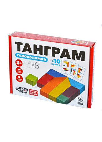 Танграм - універсальна гра-головоломка, популярна у всі часи. Танграм поєднує можливості логічної гри та мозаїки, тому діти довго не втрачають інтерес до цієї іграшки. Беззаперечні переваги нашого Танграму: книжечка інструкція на 38 логічних завданнь різної складності, а також схем-мозаїк (тварини, предмети, квіти, букви), зручно грати в дорозі, адже упаковка - поле гри! Всередині упаковки є виїмка для вкладання деталей, іграшка сертифікована і безпечна навіть для найменших, завдяки відсутності дрібних деталей. Гра розвиває: дрібну моторику рук, координацію рухів, образне мислення, аналітичне мислення, концентрацію увагу, зосередженість і посидючість. У наборі: 8 кольорових дерев'яних фігур 1 книжечка інструкція із логічними завданнями і мозаїками картонна встака в упаковці для фіксування деталей. Підійде для подарунку дитині вдома, в дитячий колектив чи садочок. Для дітей віком 3+