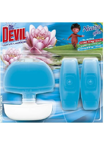 Туалетний блок для унітазу Dr.Devil (Др.Девіль) Лагуна Лотоса - рідкий туалетний гель у підвісному пластиковому футлярі. Він приємно пахне та підтримує гігієнічну чистоту туалету. Основні переваги: концентрований рідкий туалетний блок, який очищатиме і митиме ваш туалет при кожному змиві має зручну форму, легко кріпиться на краю унітазу, а його дія взагалі не потребує ваших зусиль містить туалет гігієнічно чистим і запобігає утворенню вапняного нальоту, бореться з накипом, брудом та неприємними запахами завдяки унікальній системі дозування продукту, при кожному промиванні виділяється однакова кількість гелю, якого вистачає до 400 полоскань засіб дарує захист та свіжість протягом тривалого часу. Спосіб застосування: Вставте контейнер у тримач і натисніть на нього, щоб він зафіксувався на місці при натисканні. Не знімайте кришку, проткніть її, прикріпивши до тримача. Для досягнення найкращого ефекту помістіть Dr.Devil у потік води, що утворюється при промиванні. Коли ємність спорожніє, замініть її на новий картридж. Характеристики Кількість в упаковці: 3 шт. по 55 мл Виробник: Dr.Devil, Чехія.