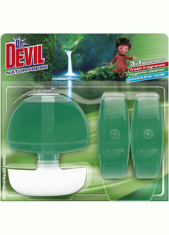 Туалетні блоки для унітазу Dr.DEVIL кульки Свіжість Природи для повного догляду за вашим туалетом. Забезпечує сяючий блиск і тривалу свіжість, утворює пишну піну, бореться із забрудненнями, очищає унітаз при кожному змиванні, запобігає утворенню вапняного нальоту, дарує стійкий аромат свіжості.