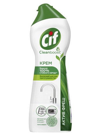 Крем для чищення Cif Clean Boost - покращена формула клінбуст. Очисні компоненти -100% натурального походження. Переваги: без різкого аромату; не пошкоджує поверхню та не залишає розводів; легко та делікатно видаляє навіть застарілий жир та бруд на кухні та у ванній; безпечний для зон приготування їжі - не потребує змивання водою, достатньо протерти чистою ганчіркою; підходить для чищення різних типів вологостійких поверхонь: акрилових ванн, склокерамічних плит, мийки, ванної, стільниці, духової шафи чи сантехніки. Спосіб використання: струсити перед використанням. Нанесіть крем на вологу ганчiрку або безпосередньо на поверхню. Для досягнення найкращого результату залишіть на декілька хвилин. Злегка потріть та змийте водою.