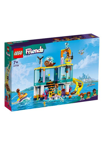 Діти, які люблять тварин, можуть розігрувати історії про океан за допомогою конструктора LEGO Friends Морський рятувальний центр. У набір входять: 3 міні-ляльки; 2 морські видри; морський коник; морська черепаха; безліч аксесуарів, що надихають творчу гру. Діти можуть використовувати водний скутер, щоб під'їхати до причалу, а потім зайти всередину, щоб почистити, зробити рентген та погодувати видр. Пізніше вони можуть допомогти видрам потрапити до реабілітаційної зони. Коли видра знову почуватимуться добре, вони зможуть повернутися назад до океану. Серед аксесуарів є рятувальний жилет, пляшечка для годування, рація, скриня зі скарбами, фотоапарат, комп'ютер, мікроскоп, шприц та рентгенівський апарат. Діти можуть насолоджуватися легкою будівельною пригодою за допомогою програми LEGO Builder. Тут можна масштабувати та обертати моделі в 3D, зберігати набори та відстежувати прогрес. Розмір моделі: 23 х 20 х 19 см. Кількість деталей: 376. Ідея подарунка для дітей від 7-ми років, які обожнюють видр та морських мешканців. Розмір упаковки 7 x 38 x 26 см
