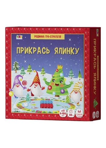 Настільна гра "Прикрась ялинку" — це весела святкова стратегія для всієї родини! Мета гри — створити найгарнішу та найошатнішу ялинку, дотримуючись умов завдань і проявляючи кмітливість та уважність. Гравці по черзі прикрашають свої ялинки: розміщують гномів, добирають до них іграшки, з’єднують кольорові гірлянди та збирають бали за правильне виконання завдань. Перемагає той, чия ялинка сяятиме найяскравіше й набере найбільше очків! У комплекті: ігрове поле, основи-ялинки, сегменти-прикраси, фішки-ялинки, картки із завданнями та гральний кубик. Ця гра розвиває логіку, уважність і вміння мислити стратегічно, створюючи водночас затишну новорічну атмосферу. Характеристики: Вага товару: 0,34 Габарити: довжина: 23,5 Габарити: ширина: 22 Стан: нове Вікова група: Від 4 років Мови: Українська Матеріал: Комбінований Тип: Настільна гра Колір: Різні кольори Упаковка: Картонна коробка Вид: Бродилка Призначення: Для всієї родини Вік: Від 4-х років Жанр: Розвиваючі Гарантія: 14 днів Стать: Унісекс Час гри: від 15 хв. Кількість гравців: 2-4 Країна реєстрації бренду: Україна Країна-виробник товару: Україна