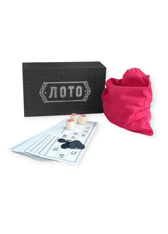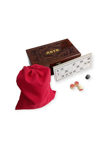 Настільна гра "Лото" - це популярна гра для дорослих і дітей, в якій гравці змагаються, закриваючи числа на своїх картках, які випадають у довільному порядку. Настільна гра "Лото" зазвичай включає наступні елементи: Дерев'яна скринька: На ній написано "ЛОТО" (кирилицею), що вказує на назву гри, вона служить для зберігання всіх компонентів. Червона торбинка: Використовується для зберігання і перемішування бочок з номерами, які витягуються навмання під час гри. Ігрові картки: Картки з пронумерованими комірками (наприклад, 9, 15, 26, 47, 59 тощо). Гравці закривають з допомогою фішок та бочок на них числа, які випадають. Бочонки (дерев'яні діжки): Дерев'яні бочки з червоними відмітками (імовірно, числами), які витягують з торбинки. Фішки: пластикові монетки, якими закривають числа на ігрових картках. Отже, це повний набір для гри в Лото.