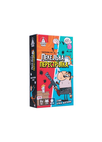 Настільна гра "Пекельна перестрілка" Vladi Toys VT8077-17 українська мова, в інтернет-магазині Land of Toys Гра настільна Vladi Toys розважальна "Пекельна перестрілка" - гра, де кожен сам за себе. Гра "Пекельна перестрілка" - перевірка на стресостійкість. Дочекайтесь своєї черги, ходіть і дійте. Знищуйте безжально суперників, адже в живих повинен залишитись тільки один! Прийнято рішення стріляти? Покажіть або скажіть в кого стріляєте і відтворіть звук своєї зброї. Чуєте звук пострілу, захищайтесь, блокуйте постріл, мінімізуйте шкоду. Зброї чимало: уявний пістолет, дробовик, граната, кулемет, револьвер, кулемет-пістолет, снайперська гвинтівка…Бронежилет, чайник або укриття стануть захистом. Та якщо це базука, начувайтесь. Хоча, можливо пощастить отримати секрет, який захистить. З-понад усього карткова гра “Пекельна перестрілка” тренує вміння програвати - необхідна якість у дорослому житті. Адже це досвід, який навчає і допомагає підліткам цілеспрямовано йти до своєї мети, не здаючись, при першій же поразці. Виробляє розуміння, що шлях до мети може бути складним. Кількість гравців: 2-5. Тривалість гри: 10-30 хв. Комплектація: 50 карток, 50 жетонів здоров'я, 20 набоїв, правила гри. Мова: українська. Вік: 12+ років. Характеристики: Тип — Карткові ігри Вікова група - От 12 лет Артикул — VT8077-17