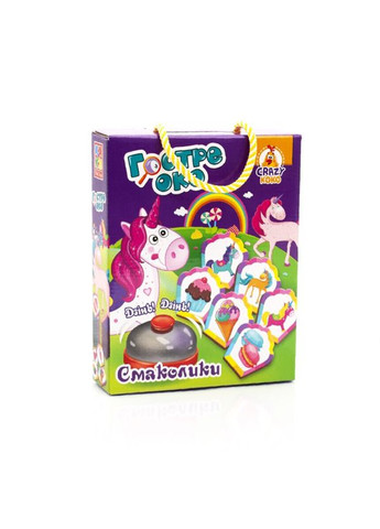 Єдиноріжки та їхні улюблені солодощі в одній коробці! Запрошуємо зіграти у захопливу гру для всієї родини. Шукайте наввипередки збіги на картках. Щойно побачите, швидше тисніть на дзвоник! Дзінь! – хто переміг? Друга гра у наборі – солоденьке меморі! Зацініть і ви! Тренуйте в ході гри уважність, швидкість реакції, память та логічне мислення. А також отримуйте безліч позитивних емоцій!