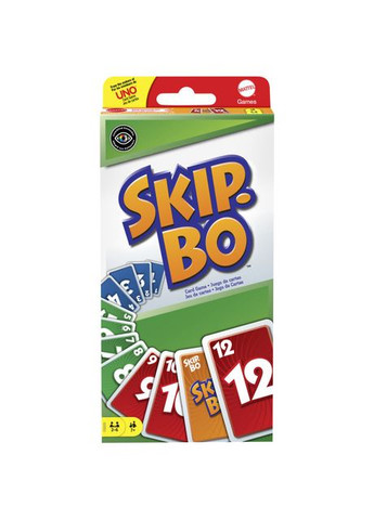 Настільна гра UNO Skip-bo – це найкраща карткова гра на послідовність.Гравці використовують майстерність і стратегію, щоб створювати стопки послідовно пронумерованих, зростаючих карт (1,2,3,4...), поки у них не залишиться більше карт для гри. Після того, як кожному гравцеві роздано його колоду карт, гра починається з того, що він тягне карти з центральної стопки і будує до чотирьох «будівельних» стопок. «Шалені» карти Skip-Bo урізноманітнюють гру та можуть використовуватися як будь-яке число. Використовуйте ці карти з розумом, адже вони дійсно можуть допомогти вам перемогти ваших супротивників! Перший гравець, який позбудеться всіх своїх карт зі свого особистого запасу, перемагає. У наборі: 162 карти; інструкція. Рекомендовано для дітей від 7-ми років.