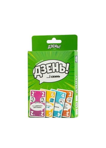 Хто першим позбудеться всіх своїх карт? Будьте пильні й слідкуйте за іншими гравцями… Можливо, хтось саме втупився в телефон. Або перепитує правила гри? Це саме те, що дозволить вам вигукнути «Дзень!» і якнайшвидше позбутися своїх карт! Стисло про правила: 1. Розігруйте карти. 2. Шукайте нагоду вигукнути «Дзень!». 3. Якнайшвидше позбудьтеся своїх карт, щоб перемогти! Вміст гри: 81 карта, 1 правила Тип гри: Швидка карткова гра. Для компанії, дітей, сім'ї. Вік: від 8 до 99 років. Кількість гравців: 2 - 7
