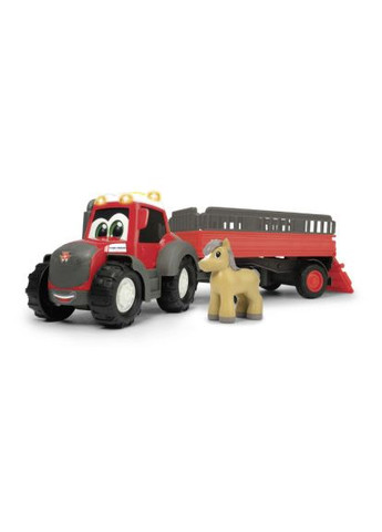 Автомодель Dickie toys АВС Трактор Массі Фергюсон створений для перевезення коней. Це ліцензована зменшена версія трактора. Завдяки деталізованому дизайну та функціональності він не залишиться без уваги малюків. Іграшка має високу деталізацію та доповнена великими очима і веселою посмішкою. А звукові та світлові ефекти додадуть веселощів до захопливої гри. Ця техніка розрахована на перевезення коней та комплектується знімним вмістким причепом і веселою фігуркою коника. Керувати трактором весело та цікаво завдяки механізму вільного ходу коліс. Доставшись місця назначення, відкрий задні двері причіпа, які слугують пандусом для тварини. Ліцензійний трактор не має гострих кутів, тому є безпечним для найменших фермерів. Виготовлений з високоякісного пластику та має яскравий дизайн. Гра з ним сприяє розвитку уяви дитини та дрібної моторики. Довжина іграшки: 30 см. Рекомендовано для дітей від 1-го року.