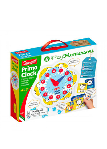 Навчальний ігровий набір серії "Play Montessori" - ПЕРШІ ГОДИННИК познайомить дитину з цифрами, поняттям про час, навчать розуміти, яка зараз година. Для кращого розуміння на циферблаті зображено поділ хвилин. Годинник демонструє аналоговий час. Для годинникової стрілки та фішок використовується один колір, для хвилинних – інший. На головному циферблаті відображається час у аналоговому форматі, тоді як на картках необхідно вказати час у цифровому форматі. Двосторонні картки з маркером, що стирається, допоможуть навчитися співвідносити час на стрілках годинника з числовим зображенням. У комплекті інструкція з посібником, як навчати дитину за допомогою набору, використовуючи принципи навчання Марії Монтессорі; цікавими фактами про годинник, час. Весь процес виробництва іграшок від проектування до упаковки готових виробів відбувається на фабриці Quercetti у місті Туріні (Італія). У набір входить: основа, циферблат, стрілки, 18 карток, 24 фішки, маркер, інструкція, аксесуари. Quercetti. Giocare intelligente. Грай із розумом. Рекомендовано для дітей віком від 4 років. УВАГА: МОЖЛИВО ПОШКОДЖЕННЯ УПАКОВКИ. Розміри (см.): 6х29х24
