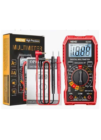 Цифровий мультиметр SZ303 - це простий у використанні прилад, що дає змогу точно й швидко вимірювати електричні величини, які використовуються під час діагностики та ремонту різної електроніки. Цей цифровий мультиметр має ручний вибір вимірюваного параметра й автоматичне визначення його діапазону, що дає змогу швидкі й точні вимірювання. Прилад вимірює постійну й змінну напругу, силу постійного й змінного струму, електричний опір і частоту. Прилад також оснащений функцією продзвонки ланцюгів, тесту напівпровідників і безконтактного визначення напруги (NCV). Результати вимірювань відображаються на великому й функціональному РК-дисплеї розрядністю на 1999 відліків з підсвічуванням. Живиться пристрій від двох батарей типу AAA, а для економії їхньої енергії має функцію автоматичного вимкнення після 15 хвилин бездіяльності. Особливості: - Точне вимірювання постійної й змінної напруг, сили постійного й змінного струму, електричного опору та частоти. - Можливість вимірювання сили струму в міліамперах і мікроамперах дасть змогу тестувати різні типи датчиків, наприклад, датчики полум'я в кліматичних пристроях. - Автоматичний підбір діапазонів вимірюваних параметрів дає змогу проводити більш швидкі вимірювання. - Висока точність під час вимірювання всіх параметрів, швидкий відгук, висока роздільна здатність й повторюваність результатів. - Великий цифровий РК дисплей з підсвічуванням і відображенням додаткових параметрів розрядністю на 1999 відліків. - Автоматичне вимкнення після 15 хвилин бездіяльності та індикація низького заряду батарей. - Функція утримання даних, тест напівпровідників (діодів, транзисторів), продзвонка ланцюгів і безконтактний детектор напруги (NCV). - Звуковий сигнал під час увімкнення/вимкнення та перемикання функцій пристрою. - Надійний захисний силіконовий чохол і складна задня підставка. Характеристики: - Бренд: ANENG. - Модель: SZ303. - Матеріал: АБС-пластик + силікон. - Матеріал тестових щупів: латунь/ПВХ. - Дисплей: РК з підсвічуванням. - Розрядність дисплея: 1999 відліків. - Частота вибірки: 3 рази на секунду. - Автоматичне вимкнення: 15 хвилин без будь-яких операцій. - Джерело живлення: батареї 2*1,5 В AAA (НЕМАЄ В КОМПЛЕКТІ). - Розмір: 142x70x32 мм. - Вага: 99 г. - Колір: чорний із червоним. Діапазони вимірюваних величин, роздільна здатність, точність: - Напруга змінного струму: 0-600 В, 0,1-1 В, ±(1,5%+8d). - Напруга постійного струму: 0-600 В, 0,1-1 В, ±(1,2%+5d). - Сила змінного струму: 200 мкА-10 А, 0,1 мкА-0,001 А, ±(2,0%+5d). - Сила постійного струму: 200 мкА-10 А, 0,1 мкА-0,001 А, ± (1,5% + 5d). - Опір: 0-20 МОм, 0,1-10 кОм, ± (1,5% + 10d). - Частота: 0 Гц-2 МГц, 0,1 Гц-1 кГц, ± (1,5% + 10d). У комплекті: цифровий мультиметр, тестові дроти (щупи), керівництво користувача (англ.), пакувальна коробка.