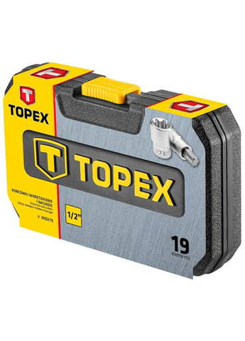 Набір інструмента Topex (3/4", 20 шт.) торцеві головки з трещіткою Ключі торцеві 3, 4", набір 20 шт., тріскотка 490 мм, 24 зубці, перемикач напрямку обертання, вороток із рухомим квадратом 450 мм, 2 шт. подовжувачів 100, 200 мм, 16 шт. шестигранних насадок, розміри: 19, 21, 22, 23, 24, 26, 27, 30, 32, 34, 36, 38, 41, 46, 48, 50 мм, сталь CrV, металева валіза. Комплектація: торцеві головки (19, 21, 22, 23, 24, 26, 27, 30, 32, 34, 36, 38, 41, 46, 48, 50 мм),тріскачка,подовжувачі (100, 200 мм),вороток з квадратом 450 мм,кейс.