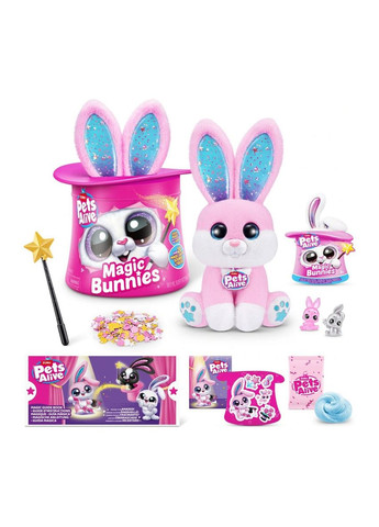 Пориньте у дивовижний світ магії та фокусів з інтерактивним ігровим набором PETS ALIVE S1 КРОЛИК-ЧАРІВНИК! Він подарує незабутні та яскраві емоції і звичайно ж не обійдеться без приємних сюрпризів! Нумо паличку візьміть й до капелюха прикладіть, проте не будь-де, а до зірки, яка блищить по серединці! Приготуйтеся відкрити для себе понад 20 різноманітних чарівних функцій! Барвисте блимання вушок, захопливі фокуси, магічні фрази та казкові мелодії разом створюють неймовірну атмосферу магії, наповнену дивацтвами і приємними сюрпризами! Не засмучуйтесь, якщо з першого разу капелюх не відкрився. Про це чарівні вушка повідомлять червоним блиманням і відповідною мелодією, тому пробуйте знову і знову! Будьте напоготові, адже у будь-який момент вушка можуть засвітитися зеленим кольором і пролунає мила мелодія. Це означатиме, що магія спрацювала! Приготуйтеся, бо до появи загадкового кролика залишились лічені моменти! Його вушка замиготять веселковими переливами та пролунає барабанний дріб. Різко смикніть за м які вушка, притримуючи капелюх, і вуаля! Під святковий феєрверк з конфетті та шквал оплесків кролик вже у ваших руках! Кожного разу, торкаючись його носика чарівною паличкою, лунатимуть три різні мелодії та магічні фрази, а вушка змінюватимуть колір дивовижним чином. Кролик-чарівник з м яким хутром, блискучими великими очима, гарнесенькими маленькими лапками й пухнастим куцим хвостиком! Проте це ще не всі сюрпризи! Торкніться чарівною паличкою золотавої зірочки всередині капелюха, щоб відчинити потаємну кишеньку, де ви знайдете від 2-х до 4-х маленьких чарівних помічників кроликів з чарівними властивостями сріблястого, блакитного чи рожевого кольорів. Кожен маленький помічник відповідного кольору має свої властивості: сріблястий може світитися у темряві, рожевий змінювати забарвлення у холодній воді, а блакитний змінювати колір під впливом сонячних променів. А також, усі маленькі помічники можуть перетворитися на топпер для олівця або до ручки. На дні капелюха є ще цікаві несподіванки! Це пухкеньке тісто для ліпки бузкового, блакитного або білого кольору й аркуш з наліпками. Усі аксесуари можуть світитися у темряві! В асортименті 2 кролики-чарівники: білий і рожевий! Зберіть їх усіх і обов язково відмічайте їх у колекційному листі, який також є у наборі! Кожен з них має свою нашийну бірку, де можна записати ім я і дату народження свого магічного улюбленця. Живлення: 3 батарейки типу ААА (входять у комплект) До комплекту входять: 1 іграшка; аксесуари; інструкція. Іграшка розвиває уміння гратися, збагачує уяву й сприяє емоційному розвитку. Рекомендовано для дітей віком від 3 років.