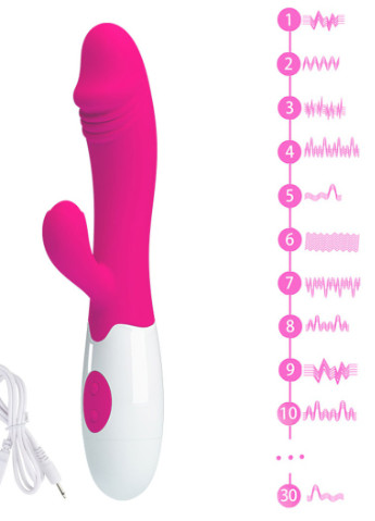 Багатошвидкісний гнучкий силіконовий вібратор анатомічної форми для одночасної кліторальної та вагінальної мастурбації, біла пластикова ручка, водонепроникний, акумулятор що перезаряджається. Розмір: висота - 19 см. (висота вводиться частини 11 см.), Діаметр вводиться частини - 2,5-3,5 см., Довжина відростка - 4 см., Діаметр відростка - 2 см. Вага 102 грам. Швидкість – 30 режимів. Заряджання від USB-кабелю (у комплекті), штекер в розетку - не входить у комплект. Матеріал: АБС-пластик, силікон. Упаковка: мелована картонна коробка із зображенням продукту та написами EN, прозорий сформований блістер.