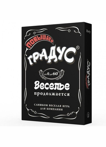 Гра для компанії «Підвищуй Градус» - неперевершений ХІТ для вибухової вечірки, гучного застілля або крутого корпоративу! Це одночасно і самостійна гра для 3 - 12 осіб, і продовження самої веселої гри для компанії «Градус». Рецепт запального настрою: збери друзів, накрий стіл та підвищуй-підвищуй Градус! А на десерт в коробці з грою - пікантна колода Полуничка (використовується, якщо хо ...). Це буде Ракета-Бомба-Петарда! Що в коробці? Базова колода - півлітра крутих завдань; Віджигалка - чекушка запальних приколів; Полуничка - 250 мл пікантного десерту. Може містити сліди: планшети гравців, жетони та правила гри. Мова: українська Міністерство охорони здоров'я попереджає: в цій грі алкоголь можливий, але НЕ обов'язковий!