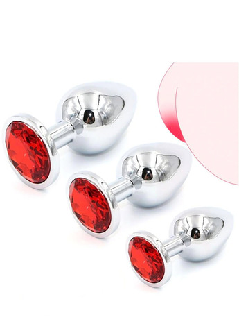 Набір трьох металевих анальних пробок різного розміру із кольоровими кристалами. Розмір та вага: - маленька (S) діаметр - 2,7 см. (окружність - 8,48 см.), висота - 7,2 см., вага: 50 грам; - середня (M) діаметр - 3,4 см. (окружність - 10,68 см.), висота - 8,3 см., вага: 90 грам; - велика (L) діаметр - 4,2 см. (окружність - 13,19 см.), висота - 9,0 см., вага: 160 грам.